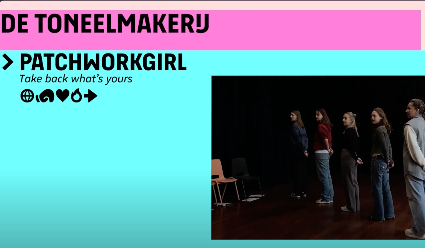 Bij TM Amsterdam zijn de verhalen van de locatie en van de bewoners van Amsterdam het startpunt van een onderzoek en voorstelling die we maken. In Patchworkgirl onderzoeken zes jonge vrouwen hoe je je staande houdt in een wereld waar jouw privé beelden razendsnel viral kunnen gaan.
